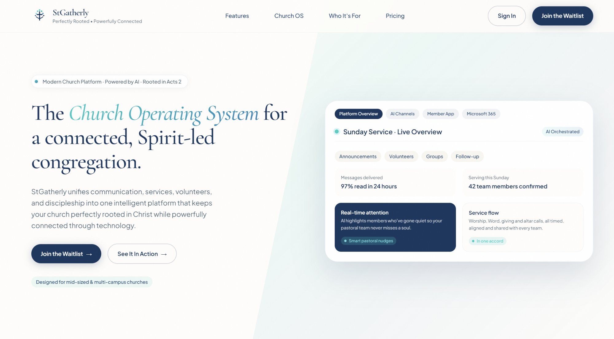 StGatherly is our newest product, built specifically for churches. It is an AI-powered church operating system that brings together everything a church needs into one platform. Powered by Kokoodi's proven technology, StGatherly lets you manage your entire church through natural language and intelligent automation.